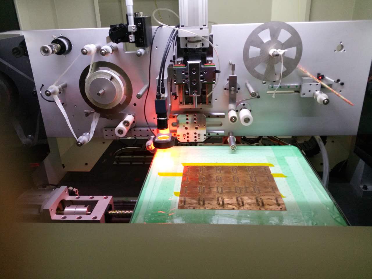 用途:主要运用在柔性线路板行业,将卷装补强板原材料使用设备模具冲型,配合X、Y轴移动与CCD相机扫描,将其贴合到设备加热板之FPCB(柔性)