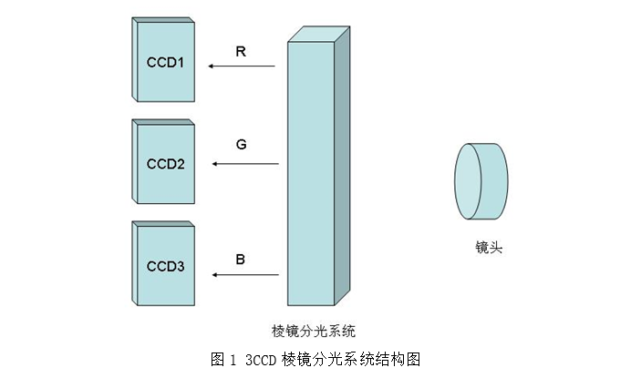 3CCD采用彩色分光棱镜进行分色,分色后的不同波长的影象用3块感光材料分别记录,再通过软件进行合成。这种方式的优点是色彩还原较好,但如果3个通道的信号处理不好会造成套色不准。其结构如图1所示意:
