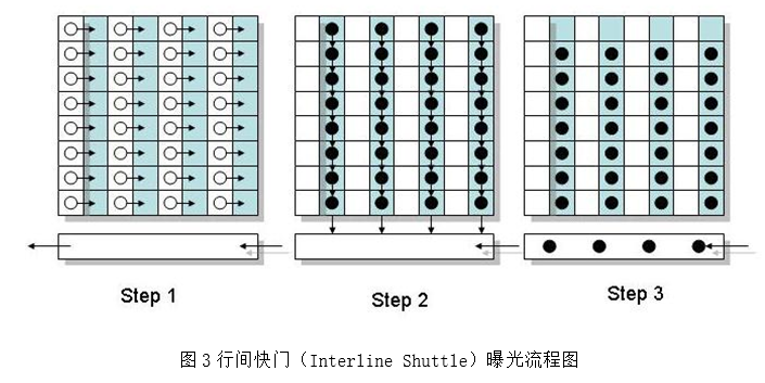 行间快门的遮光区存储单元和感光单元一一对应,都分布在感光平面上。曝光开始以前,像素上的信息不被记录,当系统发出复位信号以后,像素上的信息被清除,并记录暗电流信息,然后系统开始曝光。曝光时间到达后,感光区上的信息被迅速转移到对应的遮光存储单元内,然后感光区复位,准备下一次曝光。这些过程只需要一个时钟周期。再下一次曝光开始前,存储区的信息再转移到DSP电路中,经过处理后存储到数字相机的存储介质中。