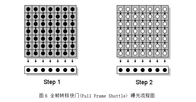 对于帧转移快门,感光材料也存在着感光区和存储区,但位于两个不同的位置。这种感光材料的实际面积要2倍于行间快门结构的感光材料,所以CCD的感光平面上都是像素感光单元,感光灵敏度可以很高。但这种结构的缺点是一个时钟周期内,像素的信号只能传递出去一次,所有像素的信息传递需要n个(n为感光材料的垂直分辨率)周期才能完成传递过程,因此速度受到一定的影响。