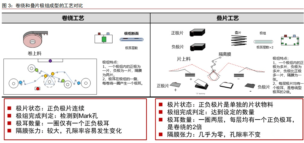 叠片与卷绕的主要差别在于模切和极组成型两道工序。传统方形电池卷绕工艺与叠片工艺流程差异主要在模切工序和极组成型工序,其他工序的加工方法差别不大。