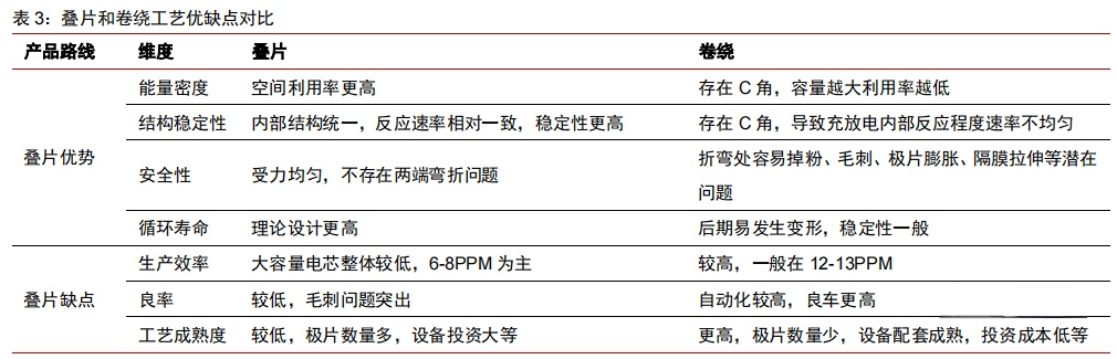 1)更高的体积能量密度上限:在相同体积的电芯设计情况下,叠片电芯的能量密度高出约 5%左右