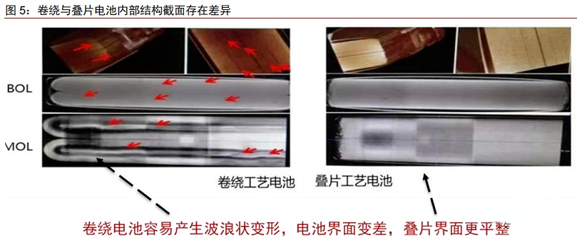 3)极组形态,在层数相同条件下,叠片电池的极耳数较卷绕电池多一倍。