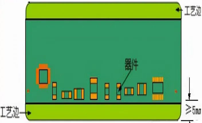 工艺边就是在PCB板两边或者四边增加的部分,主要为了辅助贴片插件焊接走板,即方便于SMT贴片机轨道夹住PCB板并流过贴片机,如果太过于靠近轨道边的元器件在SMT贴片机吸嘴吸取元器件并贴装到PCB板上时,就有可能发生撞件现象,导致无法完成生产,因此必须预留一定的工艺边,一般宽度为2-5mm等。这种方式同时也适用于一些插件元器件,在经过波峰焊时防止类似现象。