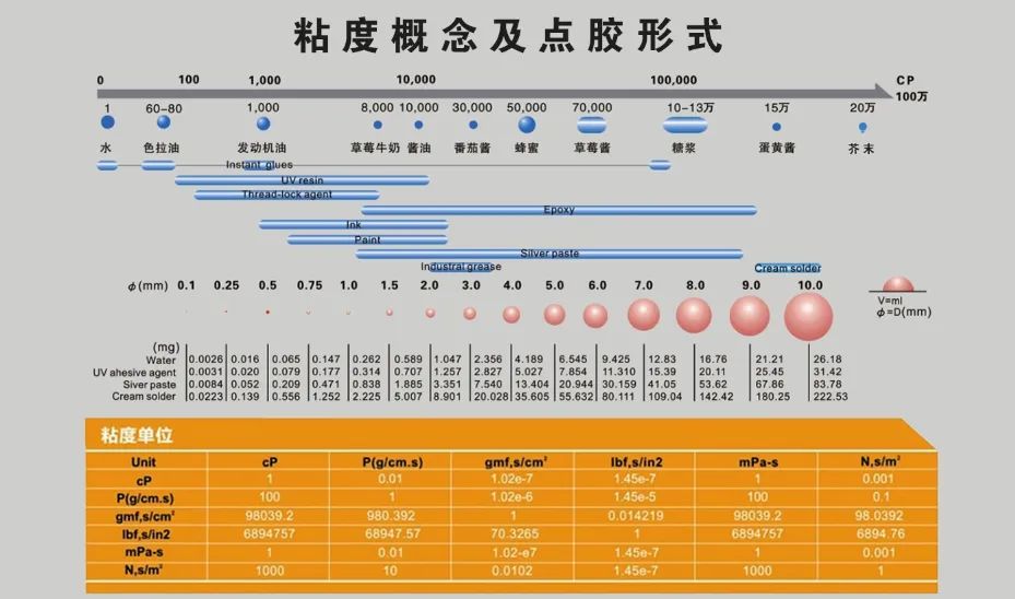 胶的粘度直接影响点胶的质量。粘度大,则胶点会变小,甚至拉丝;粘度小,胶点会变大,进而可能渗染产品。点胶过程中,应对不同粘度的胶水,选取合理的压力和点胶速度。