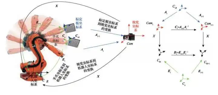 只需在机械臂末端固定一个棋盘格,在相机视野内运动几个姿态。由于相机可以计算出棋盘格相对于相机坐标系的位姿A_i 、机器人运动学正解可以计算出机器人底座到末端抓手之间的位姿变化E_i 、而末端爪手与棋盘格的位姿相对固定不变。