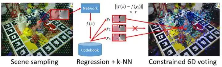 它的方法大概是这样:对于一个物体,取很多小块 RGB-D 数据(只关心一个patch,用局部特征可以应对遮挡);每小块有一个坐标(相对于物体坐标系);然后,首先用一个自编码器对数据进行降维;之后,用将降维后的特征用于训练Hough Forest。