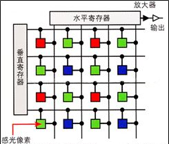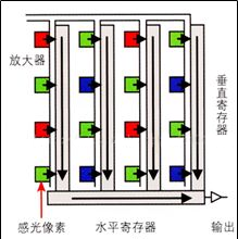 在感光像点接受光照之后,感光元件产生对应的电流,电流大小与光强对应,因此感光元件直接输出的电信号是模拟的。在CCD传感器中,每一个感光元件都不对此作进一步的处理,而是将它直接输出到垂直寄存器,传到水平寄存器中,最后才能形成统一的输出。由于感光元件生成的电信号实在太微弱了加上在此过程中会产生大量电压损耗,无法直接进行模数转换工作,因此这些输出数据必须做统一的放大处理—这项任务是由CCD传感器中的放大器专门负责,经放大器处理之后,每个像点的电信号强度都获得同样幅度的增大;因信号只通过一个放大器进行放大,所以产生的噪点较少。但由于CCD本身无法将模拟信号直接转换为数字信号,因此还需要一个专门的模数转换芯片进行处理,最终以二进制数字图像矩阵的形式输出给专门的DSP处理芯片。