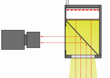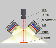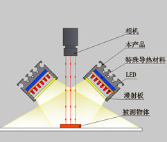 直角同轴光源主要由高密度LED和分光镜组成。LED发出光经过分光镜后,跟CCD和相机在同一轴线上,可以有效消除图像的重影,适合光洁物体表面划痕的检测。