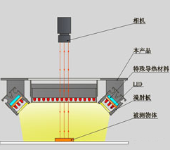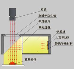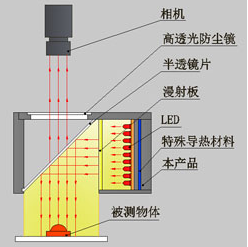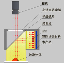 同轴光源主要由高密度LED和分光镜组成。LED发出光经过分光镜后,跟CCD和相机在同一轴线上,可以有效消除图像的重影,适合光洁物体表面划痕的检测。