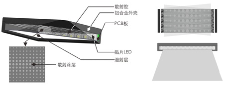 面光源,LED经光学优化设计后,均布于光源底部,经过特殊扩散材料后在其表面形成一片均匀的照射光。
