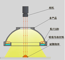 圆顶光源是一种高均匀性的光源,由高亮度贴片LED发出的光经过球面漫反射后形成均匀的光线。适合检测表面反光、起伏不平的物体。