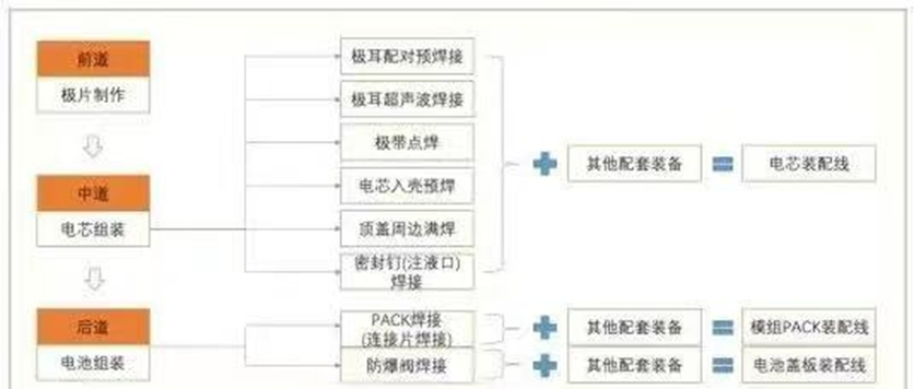 中道工艺:极耳的焊接(包括预焊接)、极带的点焊接、电芯入壳的预焊、外壳顶盖密封焊接、注液口密封焊接等;