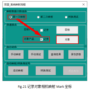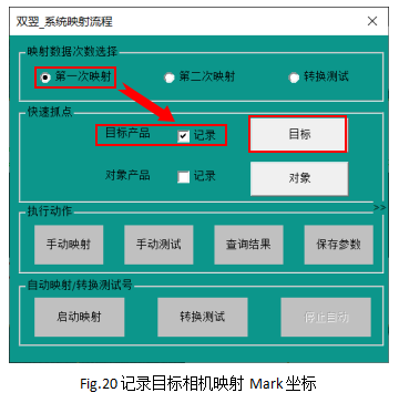 1) 系统全体停止,将TP搬运到目标相机下,打开映射界面,勾选第一次映射,再勾选目标产品“记录”,点击“目标”按钮,系统会抓取Mark点的坐标。