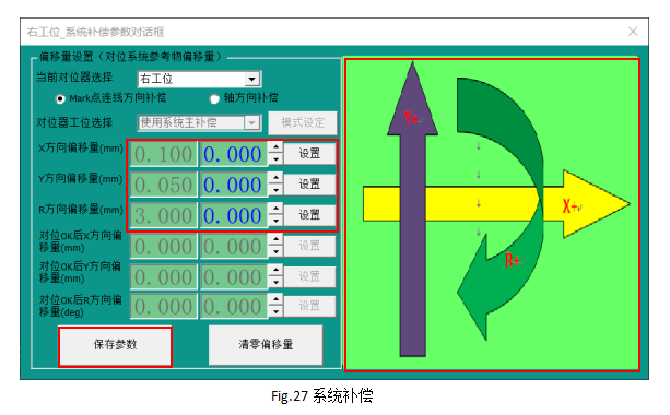 根据补偿方向图示,在右侧对应的方向补偿写入补偿数值后,点击“设置”累加到左侧的总补偿参数中。设置完补偿参数退出前必须要点击“保存参数”,补偿才能生效。
