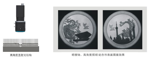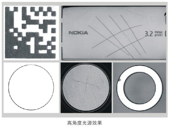 结构描述:高角度照射,表面平整部位反光比较容易进入镜头,图像亮度较高;不平整部位反光杂乱,部分光线进入不到镜头,图像亮度较低。