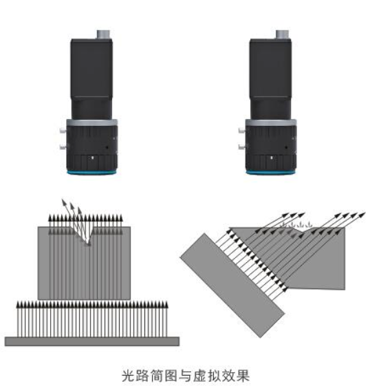 结构描述:低角度照射,表面平整部位反光无法进入镜头,图像亮度较低;不平整部位反光进入镜头,图像亮度较高。