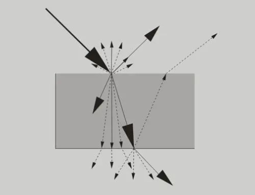 不同的表面发生各种光学现象的差异很大,例如镀膜良好的镜子表面,光照射之后几乎全部被反射,也就是镜面反射占了最主要的成分;光线接近垂直照射到玻璃上之后,几乎全部穿透,从另一面发射出去,这种情况下透射占了最主要的成分;黑色粗糙表面,基本没有光反射或者透射,几乎全部光会被吸收掉。
