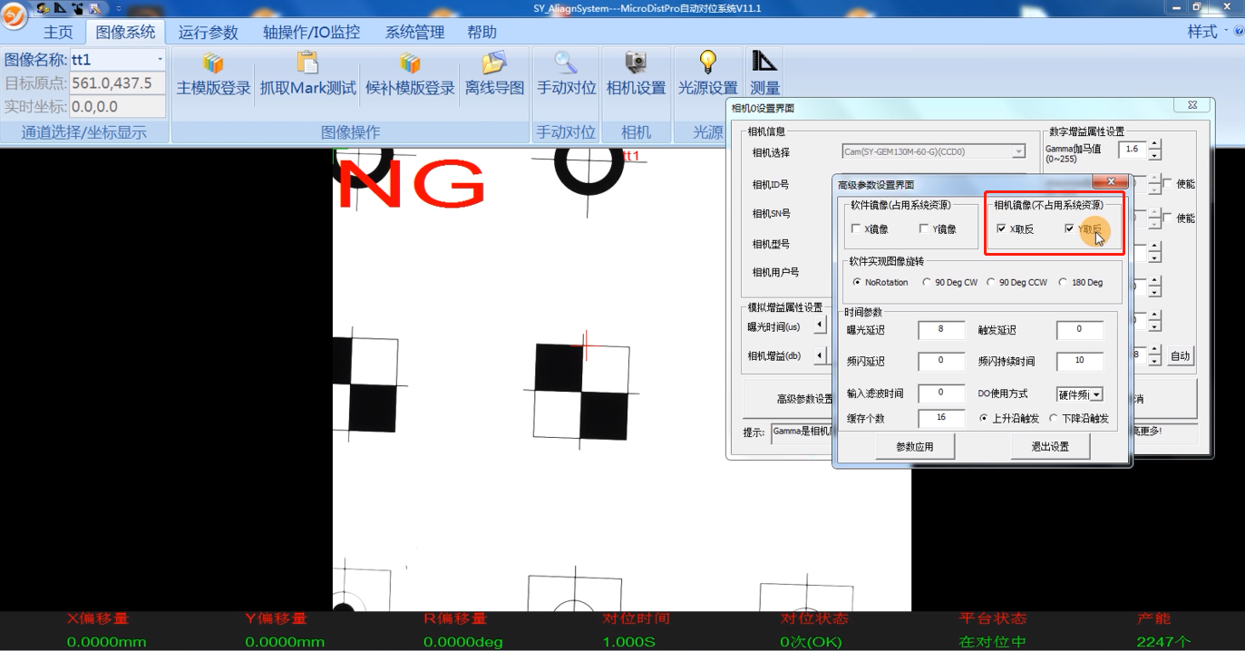 2. 点击x取反,实际物体运动x方向与相机成像方向一致,点击y取反,物体运动y方向与相机成像方向一致。可根据现场环境需要进行选择设置。