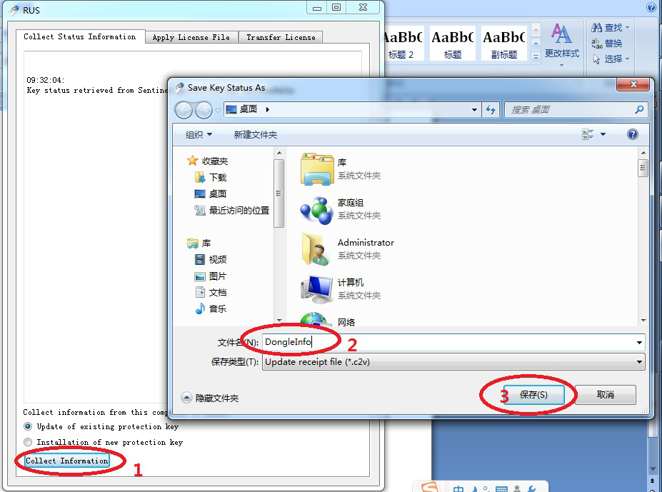 首先将Dongle插入计算机USB接口上,然后按照以下步骤来获得Dongle序列号或者收集C2V文件回传给我们。