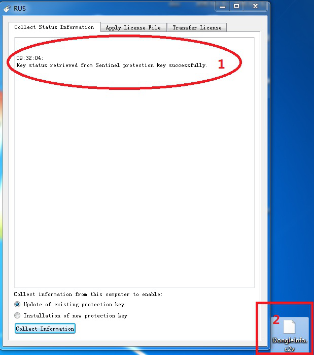 图3所示为收集c2v成功信息显示图,即c2v文件,此例中,我们将c2v文件保存在桌面上,文件名为"DongleInfo.c2v",完成c2v文件后,通过邮件将此文件回传给我方即可。