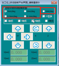 对位平台手动控制步距:当次发送偏移量的步距设置:0.5/1/2/5mm/deg;