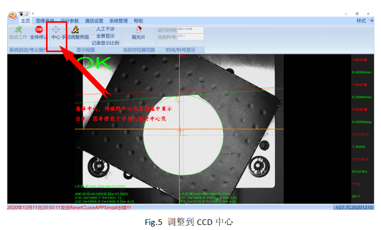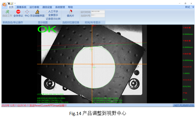 软件上点击中心,在图像中可以看到橙色的十字线,这个为视野中心,在产品上料过程中,我们需要将产品放置到橙色十字交点即视野中心位置。