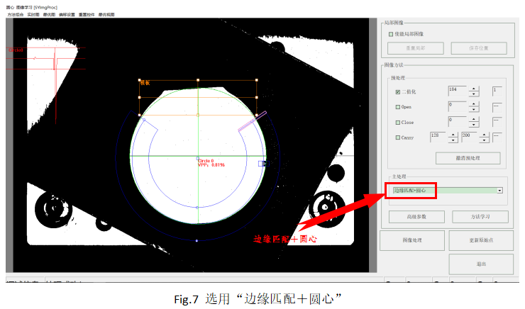? Step2:如图7所示,下拉重新选择“边缘匹配+圆心”,黄色的模板框工具和蓝色的圆心工具则会显示出来,通过拖拽调整使圆心工具的中环与Mark圆形边缘相接,模板框位置和大小到合适,再点击“方法学习”,则学习记录当前的模板。
