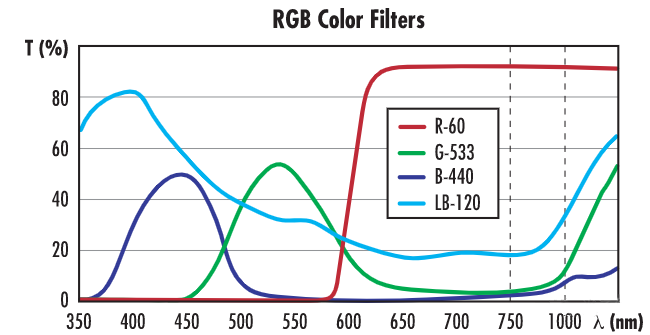 彩色玻璃滤光片在机器视觉中非常常见,它是通过在玻璃材料中掺杂选择性改变其吸收和透射光谱的元素而产生的。掺杂剂根据传输所考虑的波长而变化,并且制造过程几乎与标准光学玻璃制造相同。彩色玻璃滤光片的优势有几个原因:与干涉滤光片相比,它们的成本相对较低,更重要的是,当与广角透镜或以一定角度使用时,它们不会显示出波长传输的任何偏移。然而,彩色玻璃滤光片通常也具有宽的波段切割,不具有像涂层干涉滤光片那样尖锐或准确的曲线,并且不具有像干涉滤光片那样高的透射量。图1显示了几种常见彩色玻璃滤光片的透射曲线。注意,滤光片具有宽的波段截止,并且具有描述其传输函数的相对较浅的斜率。