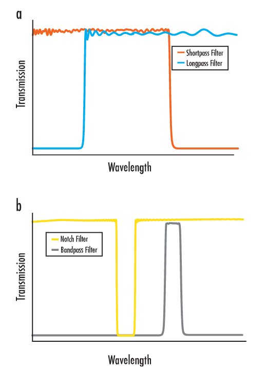 短通滤光片则相反,通过较短的波长,阻挡较长的波长。带通滤光片通过一个波长带,同时阻挡位于通带之外的较长和较短波长。带通滤光片的反面是陷波滤光片,它阻挡一段波长并通过更长和更短的波长。这些滤光片类型的传输曲线形状如图2所示。