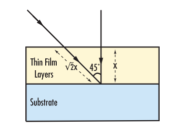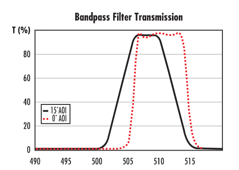专为深度阻挡(高光密度)和陡坡(从阻挡到透射的急剧过渡)设计的滤光片在精确的光控制至关重要的应用中重复使用。大多数机器视觉应用不需要这种精度;通常,光密度(OD)为4或更大的任何滤光片都比要求的更精确并且增加了不必要的成本。由于硬涂层滤光片利用光学干涉来实现这种精确的传输和抑制带,因此在机器视觉应用中使用硬涂层滤光片会带来困难。所有干涉滤光片都是为特定的入射角(AOI)设计的,通常为0°,除非另有特别指定。当用于机器视觉时,这些滤光片通常放置在镜头前面;这样做使得滤光片接受来自透镜的角视场(AFOV)所规定的角度的光。特别是在短焦距(大AFOV)透镜的情况下,透射通过滤光片的光通常会显示出一种不想要的效果,称为蓝移。例如,4.5毫米宽角度焦距透镜的蓝移将比50毫米窄角度焦距透镜大得多。随着干涉滤光片上AOI的增加,通过滤光片层的光程长度增加,这导致截止波长和截止波长减小(图3)。