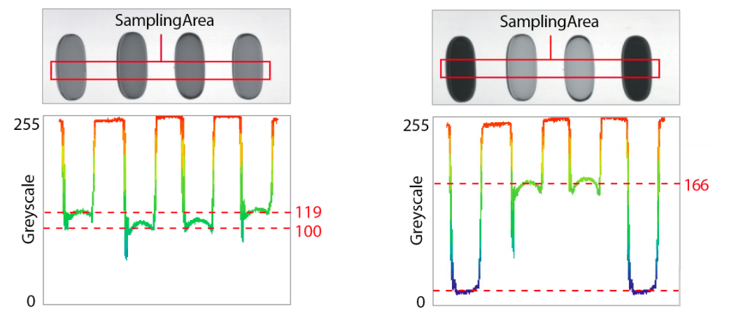 这是一种分拣应用程序,药丸需要按颜色分开才能到达各自的位置。用单色相机对胶囊进行成像(图6),绿色和红色胶囊之间的对比度仅为8.7%,低于20%的最小建议对比度。在这个特定的例子中,环境光的微小波动,例如个人走过系统,可以将已经很低的8.7%的对比度值降低到足以使系统不再能够正常操作的程度。这个问题有几种解决方案:可以建造一个体积庞大、成本高昂的挡光系统来完全封闭检查系统,可以重新设计系统的整个照明方案,或者可以添加一个滤光片来增强绿色和红色药丸之间的对比度。在这种情况下,最简单和最具成本效益的解决方案是使用绿色玻璃滤光片,以提高两种不同颜色胶囊之间的对比度。如图6所示,对比度从8.7%提高到86.5%:几乎增加了10倍。