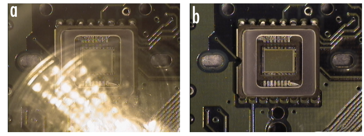 图6:使用单色相机观察胶囊,对比度为8.7%(a),使用单色相机和绿色滤光片观察胶囊,对照度为86.5%(b)。