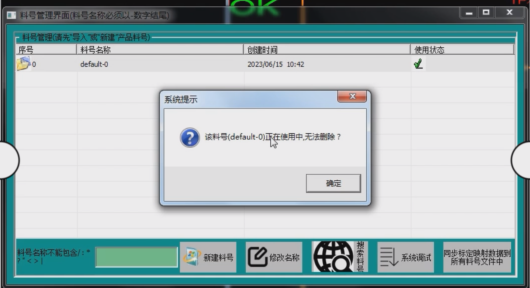 (2) 删除料号:在对应料号所在行双击鼠标右键,实现删除该料号,正在使用的料号不能删除。