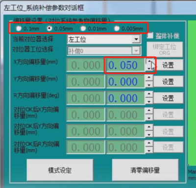 调节量档位选项:此区域有四个档位可供选择0.1mm、0.05mm、0.01mm、0.005mm,根据需求进行选择,选择完成后在点击加减键进行数据调节时,单次点击的增加/减少量,就是选择的档位量。