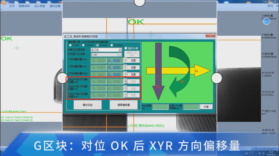 G区域:对位 OK 后 XYR 方向偏移量:即对位 OK 后,可以根据产品最终放置的位 置设定补偿的 XYR,方向可以参考右侧图像。