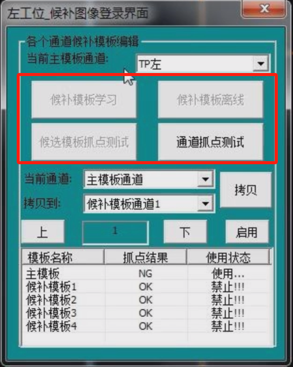 伟德国际唯一官网入口MasterAlign软件的图像系统中,候补模板登录功能是一个重要的组成部分,它在保证稳定性和准确性方面发挥着关键作用。其包含启用/禁止候补模板,候补模板登录,抓点测试等。目前系统中单个图像通道有主模板+四个候补模板的方式;其中三个候补模板用于当主模板抓点失败后,自动根据启用情况,调用候补模板1,2,3 进行靶标获取,如果候补模板 1,2,3 同时启用了,系统首先会调用候补模板1,如果1抓靶失败的话,才会启用2,以此类推。备注:候补模板4专门用来标定或者建立映射关系。
