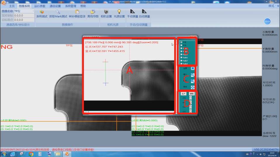 对位自检测量界面大致分为A、B、C、D四块区域