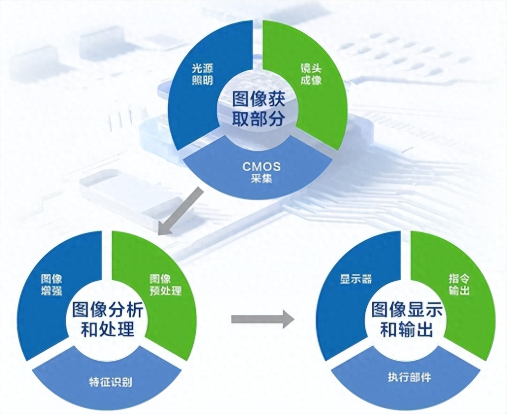 在设定光源的照射下,场景内的物体通过成像设备生成原始的数字图像,并输送到计算机系统中;然后图像在计算机中进行计算,完成图像的预处理;到这里,图像的质量已经得到了一定的改善,接下来计算机会从质量较好的图像中提取特征,构成了对原始图像的抽象描述;最后,计算机对抽象特征运用模式识别技术,得到更高层次的抽象描述。期间的图像处理过程,可以通过显示器展现出来,另外,计算机还可以根据图像处理结果对工作过程进行调整。
