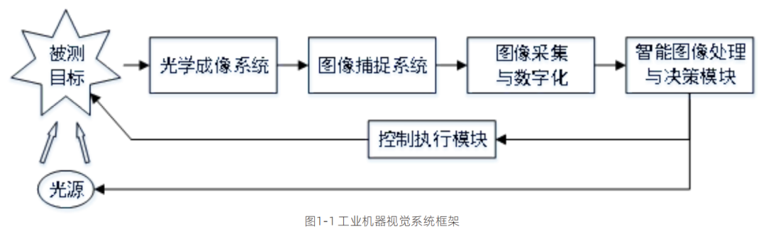 机器视觉是以普通计算机视觉研究为基础,并且同时涉及到光源照明技术、高速图像采集等方面实用技术的研究。在工业中,利用机器视觉构建一个完整的工业视觉应用系统需要结合多种技术,其中涵盖了机械工程、传感器、光学成像、运动控制、图像处理等方面。图1-1显示的是实际工业中机器视觉系统整体框架,主要包括被测目标、光源、光学成像系统、图像捕捉系统、图像采集与数字化、智能图像处理模块和运动控制模块。