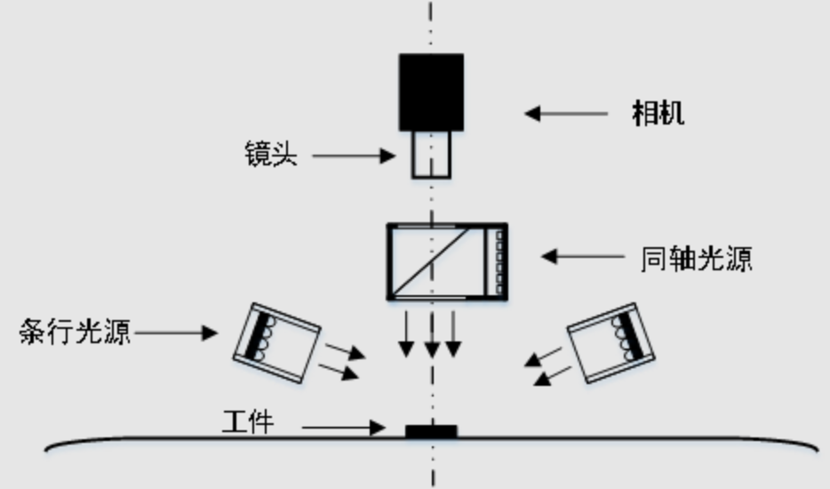 在进行点胶缺陷检测的过程中,图像信息的持续和稳定获取也是至关重要的一步,图像的好坏对于算法的设计困难程度有着很大的影响,因此,在点胶缺陷检测系统的设计过程中,需要对光学检测时的硬件进行选型。如图2-1所示,考虑到胶条为透明胶,存在反光现象,所以要求光源在各个角度的光照程度较为均匀,而同轴光具有高密度排列,成像清晰,亮度均匀等特点。此外,在要求光照亮度均匀的同时,由于部分胶条中存在气泡,而同轴光源距离胶条存在一定的距离,采集到的图片无法观察到气泡特征,故考虑使用条形光源对胶条上方进行照射,使得气泡特征可见。由于垂直照射方式具有照射面积大、光照均匀性好等优点,故同轴光源选择垂直照射方式,而条形光源主要是为了对胶条进行光照加强,同时为了不遮挡同轴光源,故选择侧面照射。