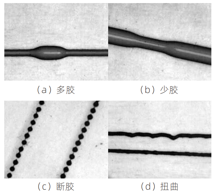 在实际的点胶过程中,往往因为点胶量的大小、点胶压力、针头大小、胶水的粘度以及胶水温度等因素,导致生产的胶条会存在各种各样的缺陷,从而影响产品的质量。工业生产中比较常见的几种缺陷种类,其具体定义如下所示: