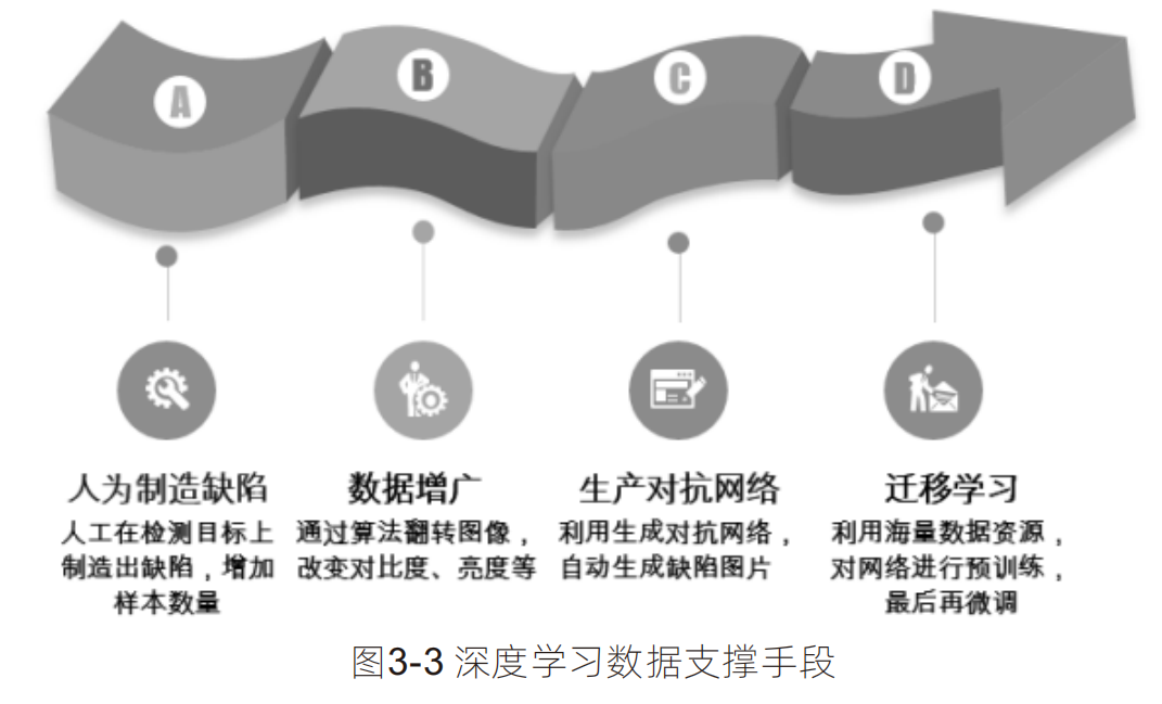 在工业领域中,可以在人为制造缺陷、数据增广、生成对抗网络、迁移学习等手段解决相应的训练数据问题。如图3-3为深度学习数据支撑手段。