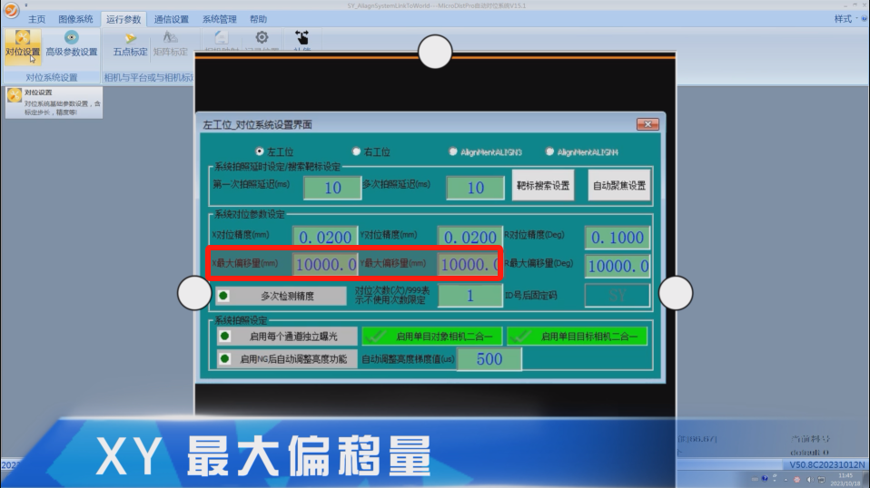 XY 最大偏移量:对位过程中对位平台 X 方向/Y 方向最大可以移动的距离;
