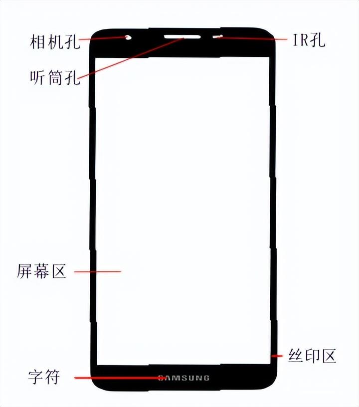行业研究成果:根据智能手机玻璃盖板的结构特征区域分割,手机玻璃盖板部分包含:丝印区、屏幕区、相机孔、IR孔以及字符特征。