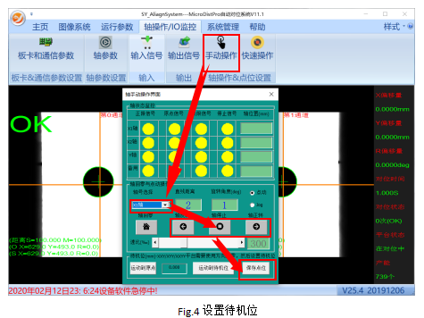 设置待机位之前需要启动复位进行平台回零,回零完成后点击“轴操作/IO监控”->“手动操作”弹出轴操作界面,选择X1轴,填写点动距离,通过手动点击正反转操控X1轴到限位中间位置,最后点“保存点位”。同理设定X2轴和Y轴的待机位置,如此便完成了对位平台待机位的设定。