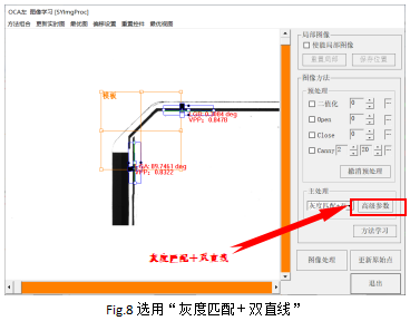 ? Step2:如图8所示,下拉重新选择“灰度匹配+双直线”,黄色的模板框工具和蓝色的直线工具则会显示出来,通过拖拽调整先使两个直线工具的中线分别与产品的水平边和垂直边的边缘相接,然后调整模板框位置和大小到合适,再点击“方法学习”,则学习记录当前的模板。注意直线工具的极性和找边方向。