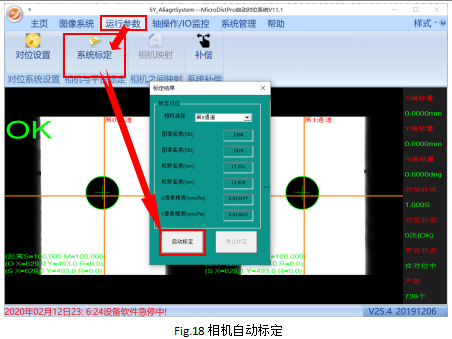 系统全体停止的状态下点击“运行参数”->“系统标定”,弹出标定界面后,点击“启动标定”即可开始标定,系统提示标定完成即完成标定。