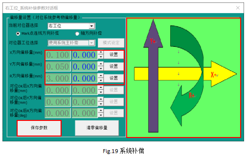 根据补偿方向图示,在右侧对应的方向补偿写入补偿数值后,点击“设置”累加到左侧的总补偿参数中。设置完补偿参数退出前必须要点击“保存参数”,补偿才能生效。