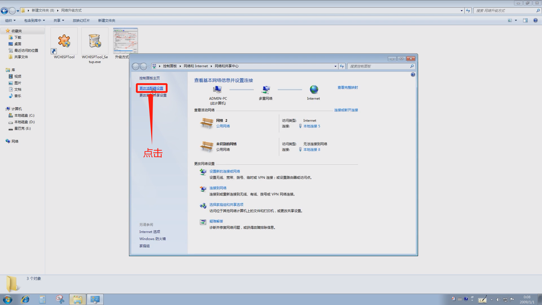 点击“更改适配器设置”打开网络连接界面,检查网络适配器